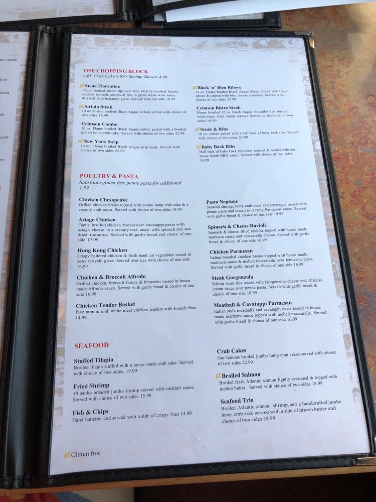 Introducing Crimson American Grill, a casual American restaurant located at 1839 S Queen St in York, PA. This establishment offers a variety of amenities such as outdoor seating, delivery, and catering services. With a full bar, happy hour specials, and a menu catering to diverse tastes, Crimson American Grill is a perfect spot for gatherings with friends and family. The menu features delicious options like Bavarian Pretzel Sticks, Wings in various flavors, Prime Rib, and Fried Captains Seafood Platter. Appetizers like Crab Dip, Calamari, and Spinach & Artichoke Dip are must-tries. The salads, including the Caesar Salad and Deluxe Greek Salad, are fresh and satisfying. Whether you're looking for a quick bite or a full meal, Crimson American Grill has something for everyone. Don't miss out on the flavors and ambiance this restaurant has to offer.